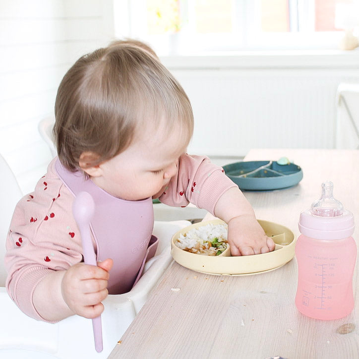 Everyday Baby silikontallrik med sugkopp är designad för att passa de flesta barnstolsbrickor och plana ytor, vilket gör den praktisk både vid matbordet och i barnstolen.